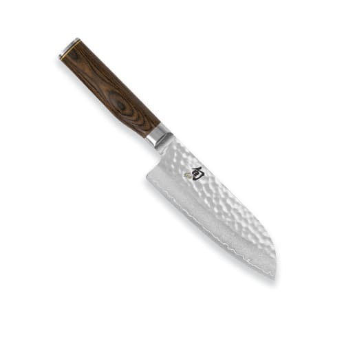 The Shun Premier Tim Mälzer Santoku 18 cm elevates the experience with its hammered tsuchime finish that reduces drag, paired with high‑grade VG‑MAX steel and luxurious walnut‑toned handled design for refined performance and style.